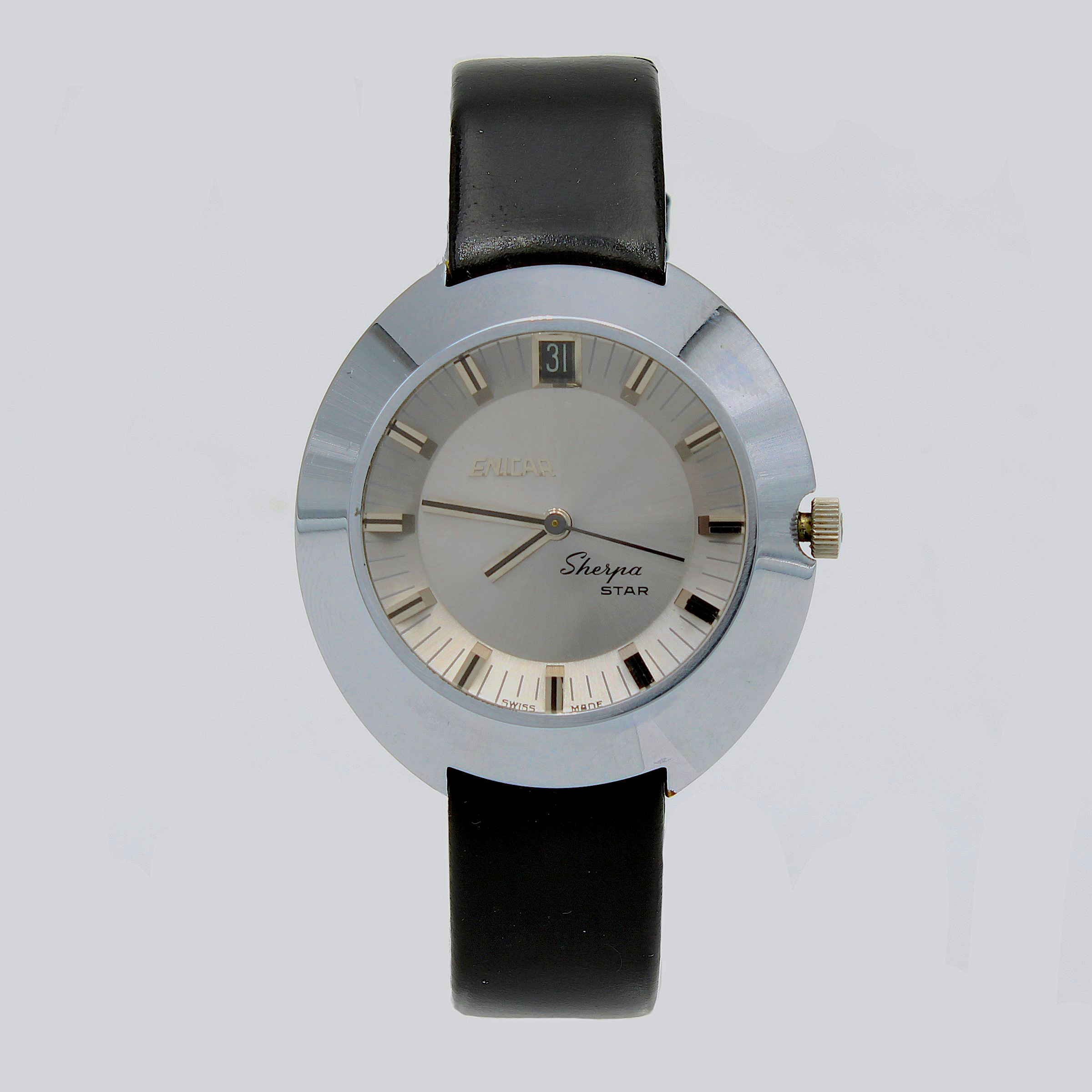 One day early in 1969 while for some reason rummaging through the top drawer of the chest in my mother’s bedroom I found a stainless steel Sherpa Star with a black leather band. I had never seen anything like it and fell instantly in love. My understanding of watches at the time did not stretch further than my father’s never-explained respect for Longines and my stepfather’s rugged Eterna-Matic, which apparently contained a tiny ball race in place of a balance jewel. The Sherpa struck me—and still does—as an irresistibly beautiful and precious object from the future, deposited by time travel among my mother’s scarves and gewgaws.